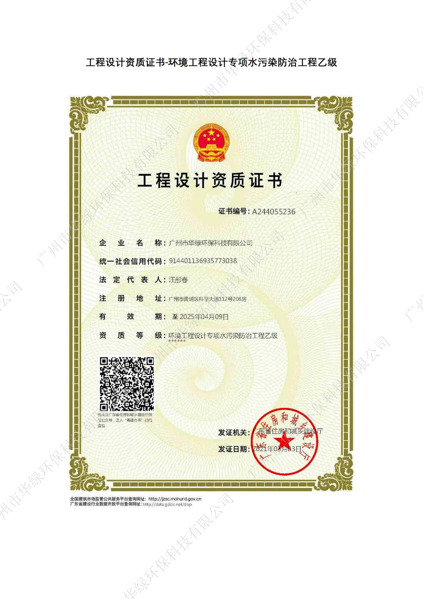工程設計資質證書-廢水治理乙級
